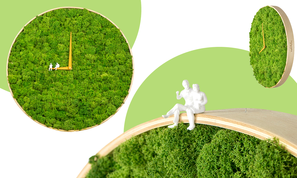 荷蘭的一個設計工作室曾設計過一款苔蘚鐘。時鐘的表面鋪滿苔蘚,沒有數字,設計者在時針處安放了兩個小小的人物,目的是希望人們在忙碌的生活中都能享受一下與親朋好友相處的時間,亦希望可以讓自然帶給大家的寧靜感覺。