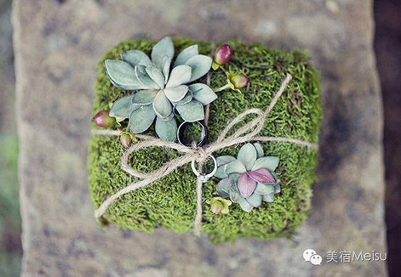 將厚厚的苔蘚系上草繩,兩枚戒指纏繞其中,還有兩株多肉相伴。誰(shuí)能想到,這是個(gè)結(jié)婚戒指盒子呢?