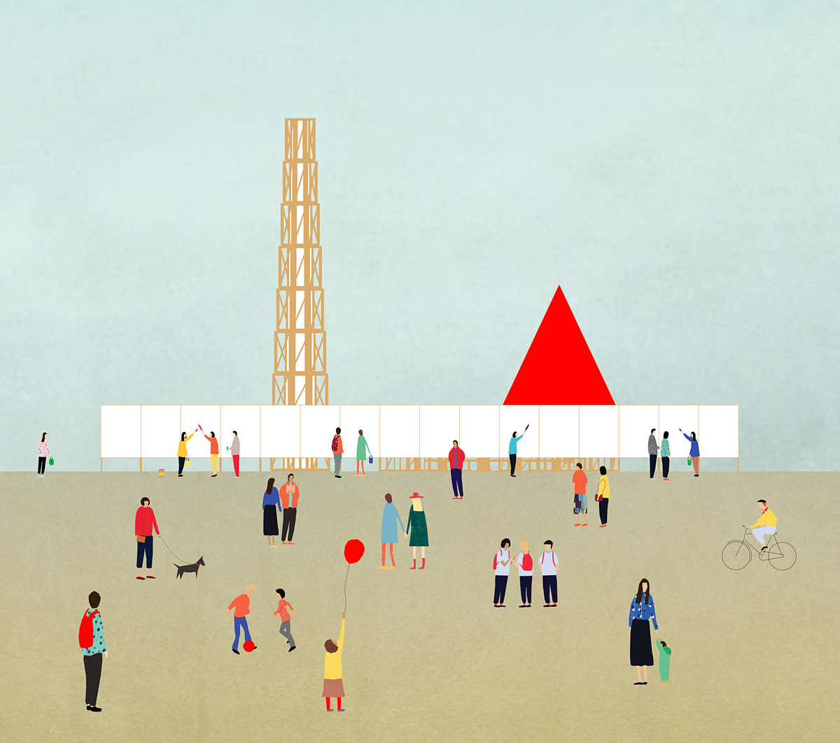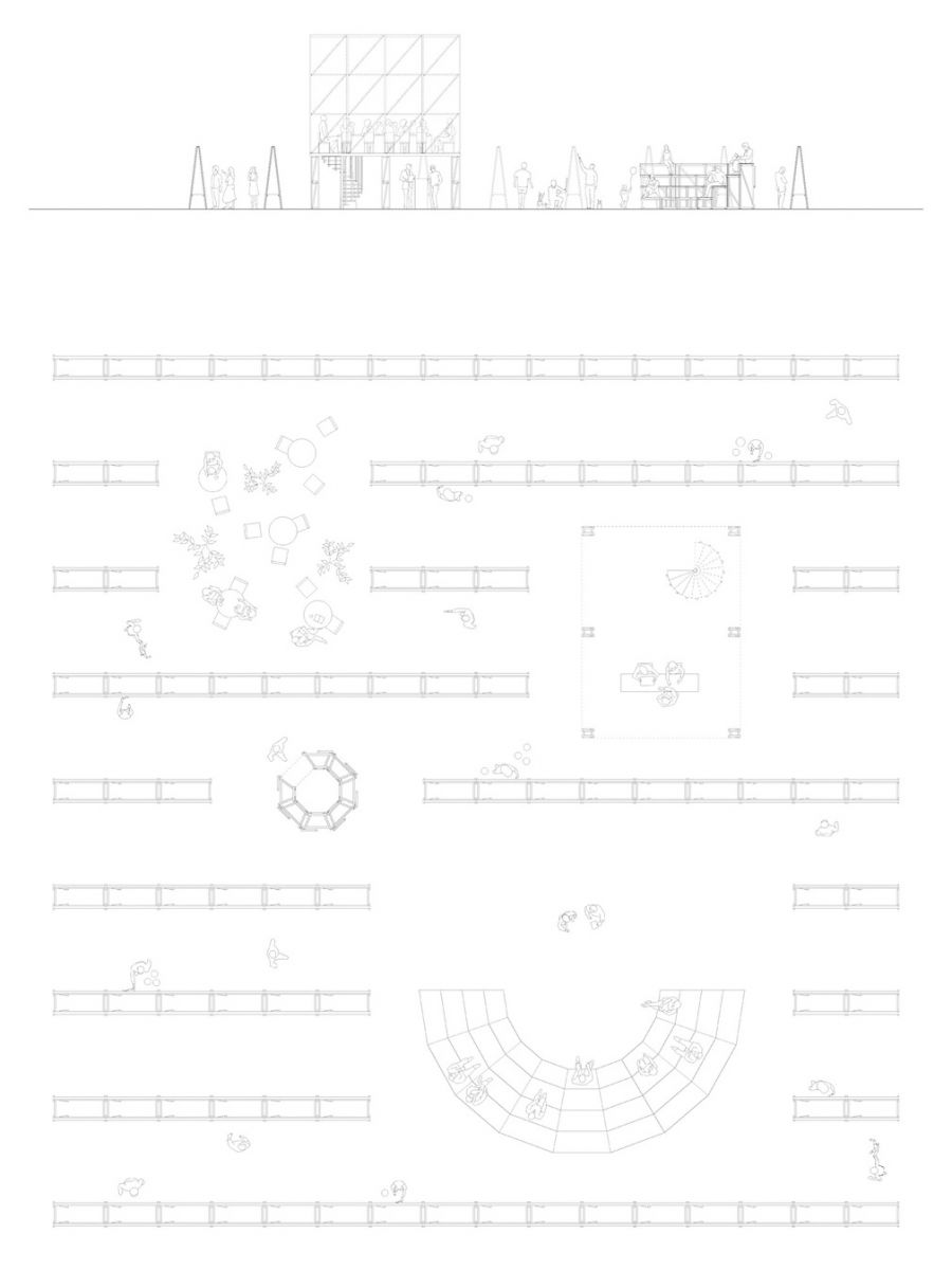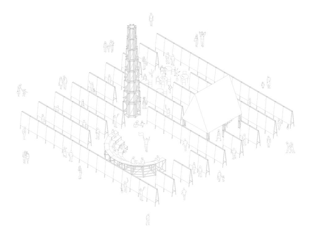 畫架是這個亭子的主要構(gòu)成單位。它們被精準的搭建,有序的安置在一個廣場上。畫架上的畫布給人們提供個人表達的機會。密集活動的節(jié)點部分將開拓出一片可供大量人群集散,交流對話,發(fā)表言論的社交平臺。除了與開放場所相關(guān)的領(lǐng)域,畫架還部署了一系列沒有天花板的墻體。這些立面結(jié)構(gòu)又能夠給個人提供相對圍合的空間。