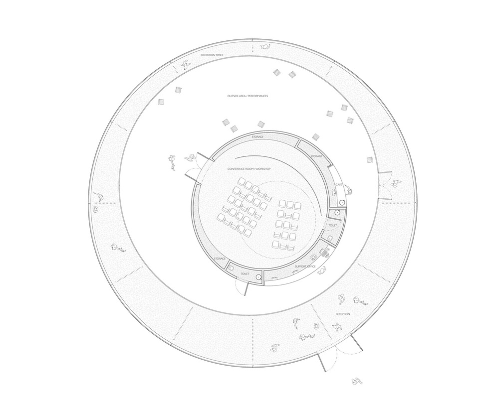 獲得第三名的這個亭子是由來自德國的設計團隊創作的。曲面墻體圍合而成的亭子,在墻壁的一處被一個單獨的門打斷。團隊設想將兩個偏離原心的曲面圓形墻壁放置在外墻體之內,以創造“一系列鑲套的室內空間:具有延展性和收縮性的閾限回廊,集體性活動的開敞區域”。