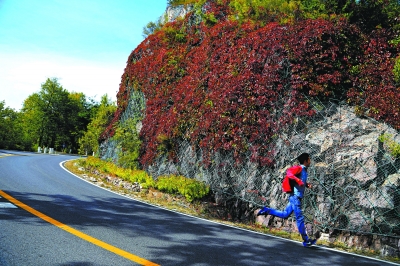位于延慶區(qū)大莊科鄉(xiāng)的昌赤路兩側(cè)大面積的爬山虎泛紅,把公路兩側(cè)裝點(diǎn)得如詩如畫。(攝影賈德勇)