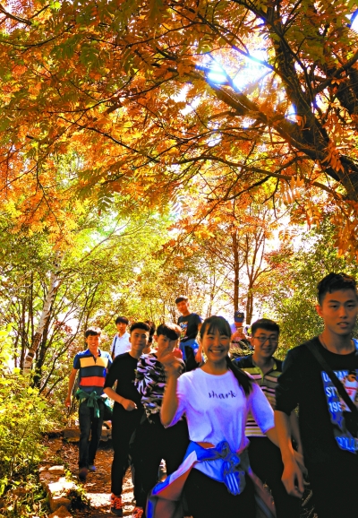 游人在懷柔喇叭溝門滿族鄉(xiāng)原始森林登高賞秋。(攝影卜向東)