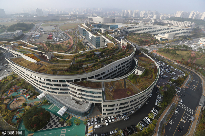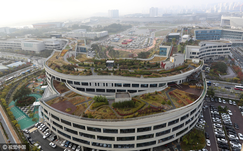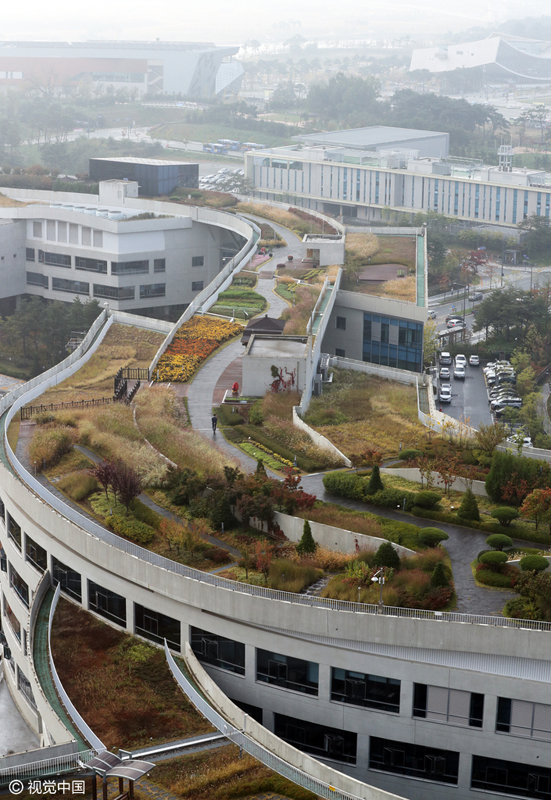 當地2016年10月17日,位于韓國世宗市的世宗市政府大樓,從空中俯瞰屋頂花園。這座屋頂花園總面積達7.9194萬平方米,是世界上最大的屋頂花園。據報道,世宗中央政府辦公樓共有15棟,占地面積55萬平方米,樓頂之間搭橋連通,并建有長3.6公里、面積7萬9194平方米的“空中花園”。園內栽有果樹、香草、藥用植物等117萬多株,并打造紫芒、野草、闊路三大主題的游覽路線。每年3月到6月和9月到12月,每天向公眾開放兩次,提供見習游園機會。
