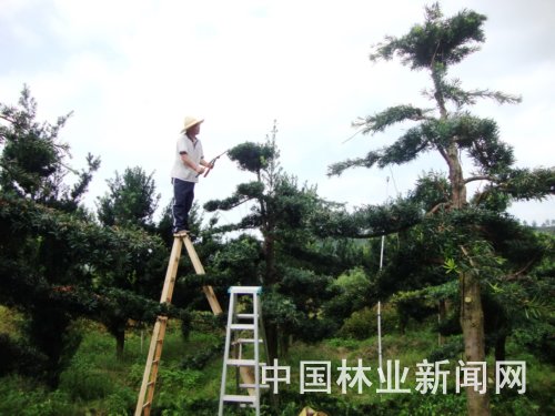 升星村苗農在苗圃修剪大樹齡造型羅漢松景觀樹