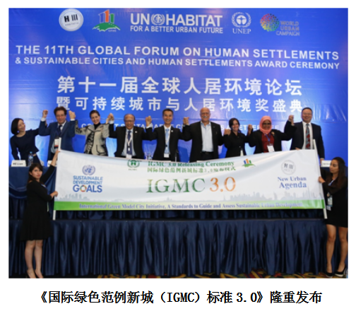 本屆論壇的成果文件《國際綠色范例新城(IGMC)標準3.0》(以下簡稱《范例新城標準3.0》)在會上隆重發布。《范例新城標準3.0》專家組組長、法國巴黎城市形態和綜合系統研究所主席薛杰先生分享了該版本的框架結構和特點,GFHS負責人、聯合國環境規劃署、聯合國人類住區規劃署和地方政府代表共同出席了發布儀式。《范例新城標準3.0》是指導和評估可持續城市發展的先進標準。它與《2030年可持續發展議程》(特別是“目標11”)和《新城市議程》相一致,為《2030年可持續發展議程》和《新城市議程》在地區和城市層面的具體實施提供了技術方法和評估手段。