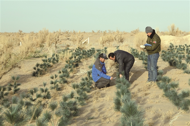 近日,在巴丹吉林沙漠東南緣的民勤沙生植物園,甘肅省民勤治沙綜合試驗(yàn)站工作人員在仿真固沙灌木固沙試驗(yàn)區(qū)測(cè)量固沙數(shù)據(jù)。