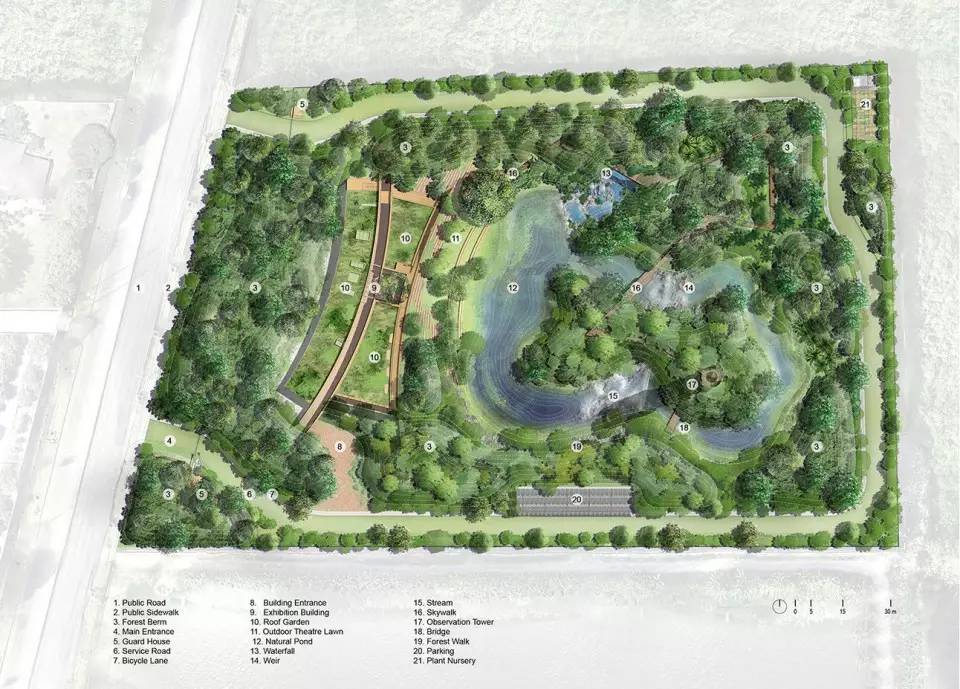 對場地的初步分析顯示,過去清淤留下的淺坑已成為了非法垃圾堆填區。2012年年初,來自LandscapeArchitectsofBangkok的團隊受PTT造林部門的邀請,為此地重建林區。在泰國石油管理局CEO的倡議下,同時也為了紀念在皇室以及公主MahaChakriSirindhorn對森林保護的重視,景觀團隊創造了一個重現泰國舊日森林系統的景觀空間,供人們游玩和學**。設計大量使用了19世紀中期曾在此地繁衍生息的各種植被,其時,曼谷附近的許多地名都是沿用了其盛行植被的名稱。