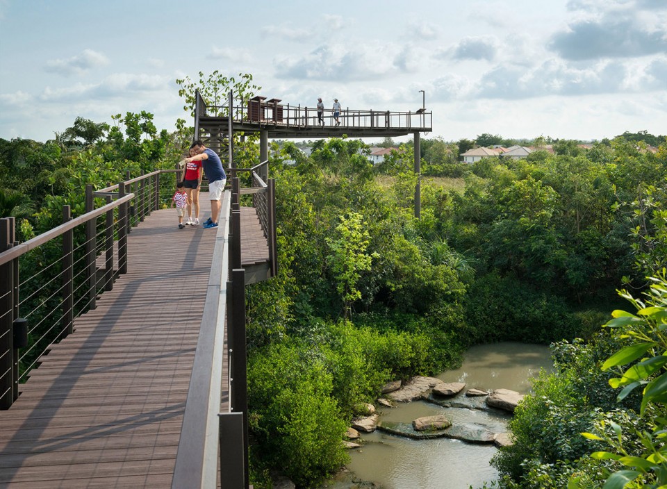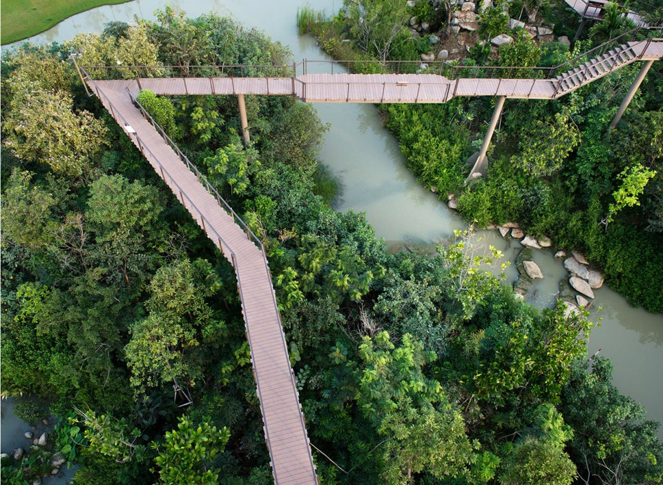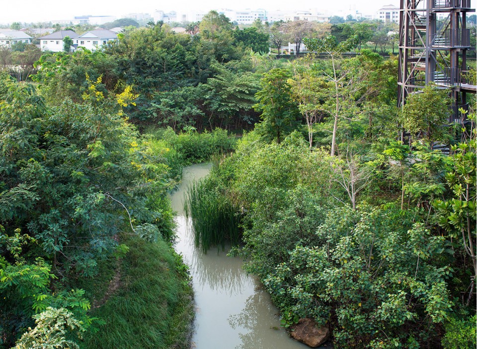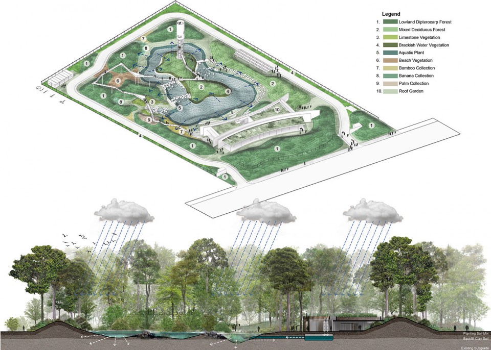 為了創造多樣化的森林生態系統,設計團隊沿用了AkiraMiyawaki博士的幼苗種植技術以創造低地龍腦香科樹木生長的最佳環境。由景觀建筑師、森林生態學家與施工團隊合作設計、建造的臺地具有多孔性,能夠保持土壤內的空氣含量。由三份表層土、一份稻殼、一份椰糠粉末和一份雞糞肥混合而成的肥沃有機土壤則為低地植被幼苗提供了相適宜的生長環境。設計團隊根據植被的演替速率和灌溉水源條件,做出了相應的植被群落的分布和搭配。諸如濱**一類適應半咸水生長環境的植被被種植在運河的堤岸之上。而耐水濕性能較強,能夠經受洪水短時間浸泡的植被則點綴在河灘的兩側。而在臺地之上,則混植著落葉樹種與低地龍腦香科樹。