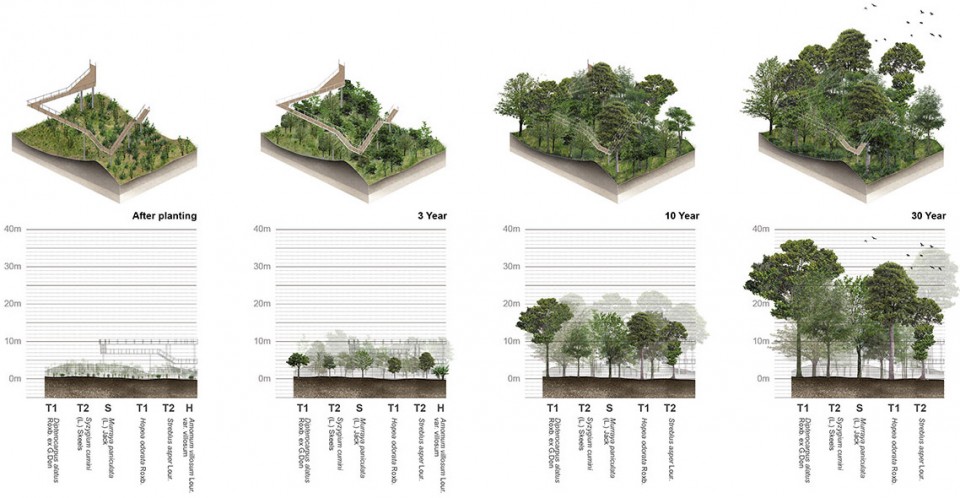 此外,種植設計師還希望通過控制植被覆蓋率、濕度和營養水平,創造出層次豐富的林冠層。設計團隊希望能夠打造一片可以自我管理、演替繁殖而無需人為介入的次生自然。而隨著森林的愈發成熟,一代代人們將持續地參與到這個項目之中,讓森林群落演替的預測性模型得以逐漸確定并反饋、實施到項目中去。