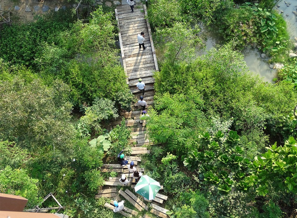人們步出瞭望塔,沿著用回收鐵路枕木鋪設而成的臺階、小道和橋梁前行