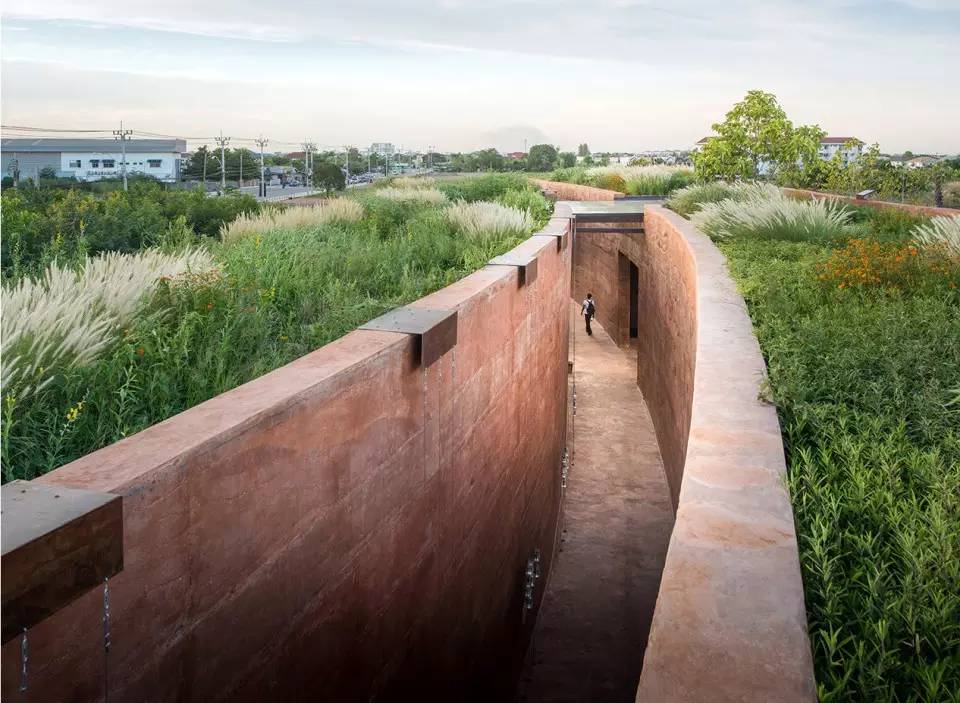 以夯實素土建造的展覽中心之上,是繁茂生長的草甸