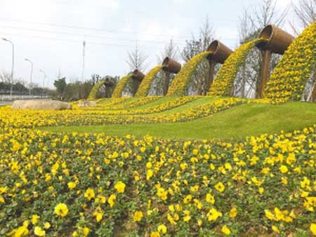 鄞州區的高速云龍出入口,以福運臨門為造型主題,綠地里大型花雕以股股流水的造型出現,道路中央隔離帶點綴上心型花籃,頓時喜慶氣氛滿溢,令人耳目一新。其他高速出入口,或以具氣勢、富創意的景觀小品來錦上添花,或以大氣流線型的植栽色塊來增彩,確保了景觀成效,切實提升了我市城市門戶形象與品質。