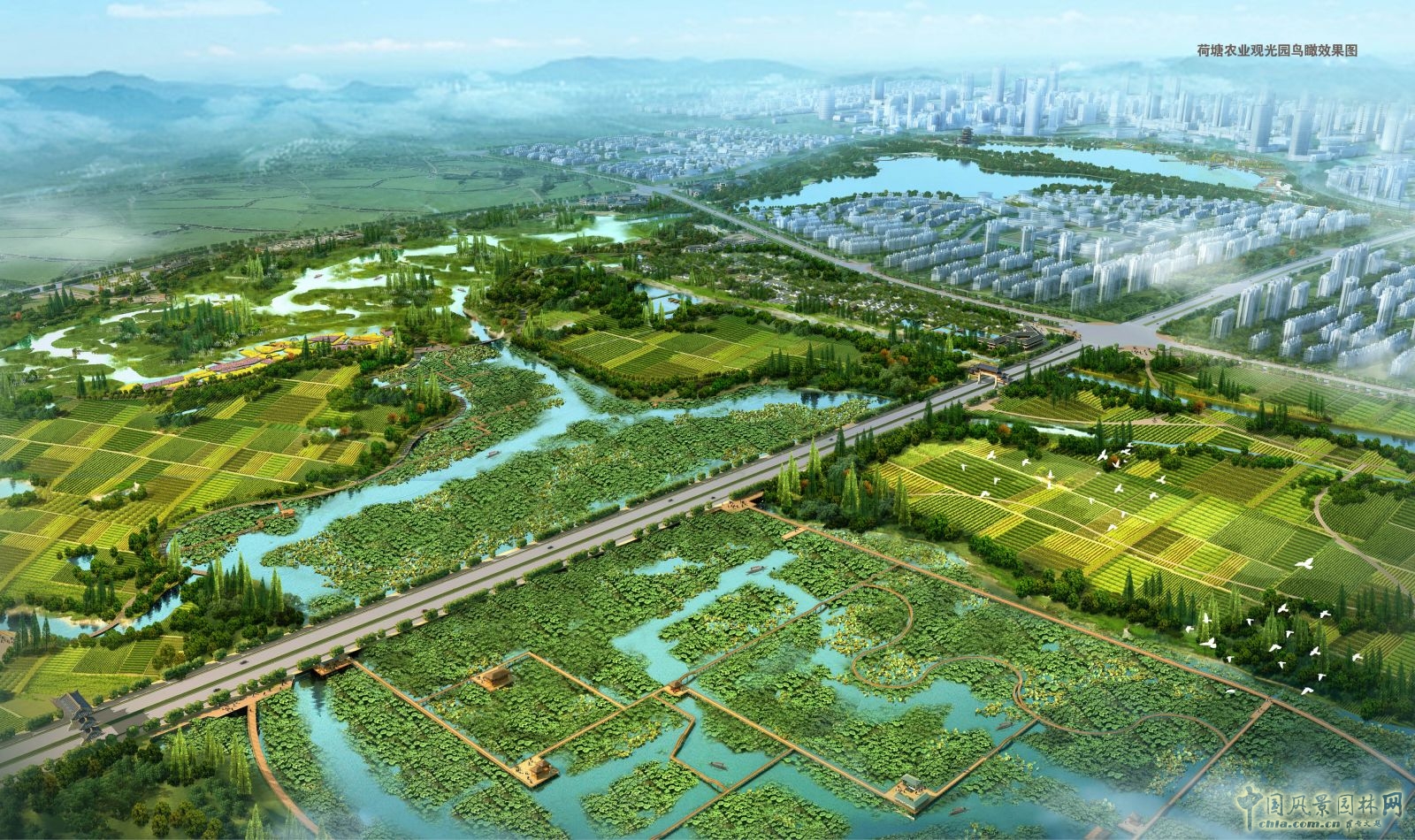 整體空間形成“湖塘相擁,山水田城”的空間格局,劃分為西湖綜合型公園、東湖生態公園、濕地公園、哀牢文化村、荷塘觀光園五大景觀功能區,通過多功能游覽道串聯五區,形成“依山臨湖、瓊臺弈閣、田園環繞、荷池相擁、哀牢部落、蘆蕩風情”的青華湖景觀意境。