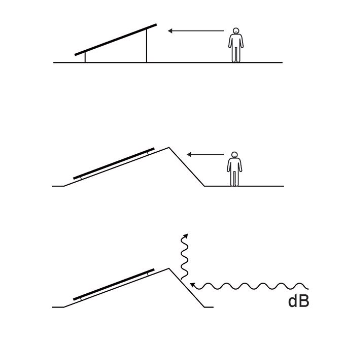 太陽能電池板受光平面與太陽形成最佳角度。太陽能電池板和電池條帶的布置方位同樣具有一定的夾角。地形同樣也是太陽能電池板和電池條帶方位構圖的一部分。太陽能場朝向與機場主軸線相平行,使機場跑道與其形成統一的整體,不僅在視覺上達到更和諧的效果,在降低周圍區域噪音的聲學效應方面也有很大的成效。