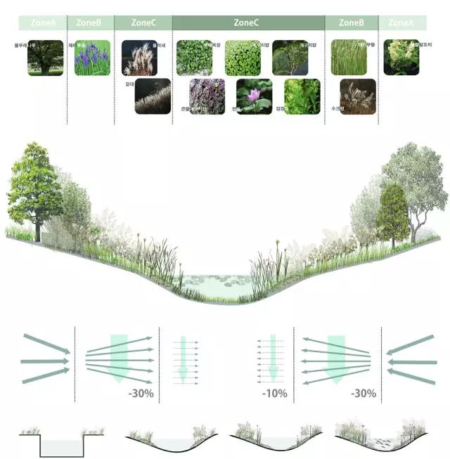 岸際陸生植物一般生長在地面或者水體邊緣濕潤的土壤里,但是根部不能浸泡在水中,一般情況下此類植物只有一定的耐水濕能力。它的種類非常豐富,主要由喬木、灌木、地被植物組成。此區域的植物選擇重點考慮其被水淹的時間,以下植物品種選擇僅作參考。
