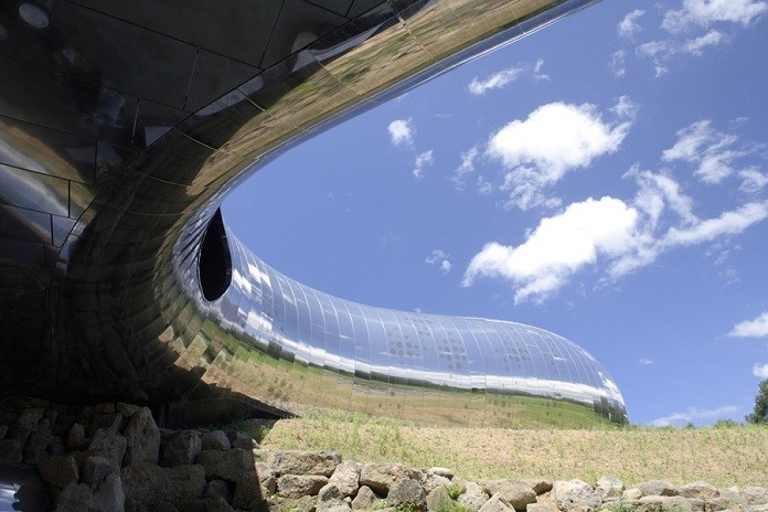 建筑師認(rèn)為建筑外皮應(yīng)該是同一種材料,柔然的,帶穿孔的,就像爬行動(dòng)物閃閃發(fā)光的皮膚,就像是從大地中釋放出來(lái)。不同釉面的地方,在某些光環(huán)境下,可以變成鏡面板,反射周?chē)沫h(huán)境。