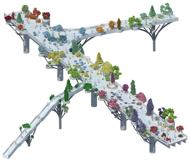 MVRDV將首爾本土植物與圓形花盆結(jié)合,打造出一個獨特的綠色空間;再將一系列城市公共空間活化劑要素比如茶餐廳,花店,自由市場,圖書館等植入其中,力求讓場所變得更有生機(jī)與可能性。與此同時,這座美麗的天橋在蔓延的過程中還衍生出系列分支,與周邊的綠地和公共空間相聯(lián)系,極大的帶動周邊城市活力與豐富性。