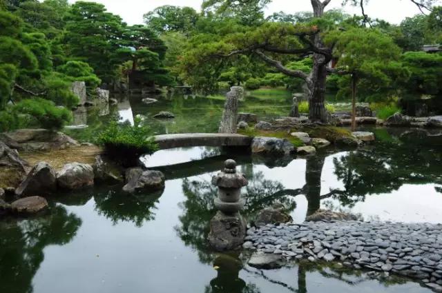 中心小島上立石燈籠,小石板拱橋相綴,沿水岸邊用鵝卵石鋪成洲浜,這一景稱為天橋立。