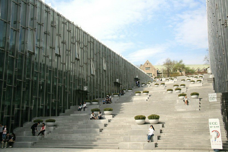 由DominiquePerrault建筑師事務(wù)所設(shè)計(jì),位於韓國(guó)首爾的梨花女子大學(xué)(EwhaWomansUniversity)校園中心,其別稱是「大學(xué)谷」,因?yàn)榛匚混渡焦榷医ㄖ旧硪蚕駦{谷。大學(xué)建筑群體設(shè)計(jì)真正做到依山就勢(shì),空間序列非常有趣;不過(guò)最惹眼的還是校園中心超長(zhǎng)的入口空間,其實(shí)臺(tái)階部分不高也不陡,只是俯瞰的視覺效果非常驚人。更好玩的是,這個(gè)「大峽谷」其實(shí)一個(gè)覆土建筑,谷兩側(cè)的玻璃幕墻后面隱藏的兩棟建筑包含教室、圖書館、劇院、商店、健身、管理用房等功能,可容納兩萬(wàn)名學(xué)生。