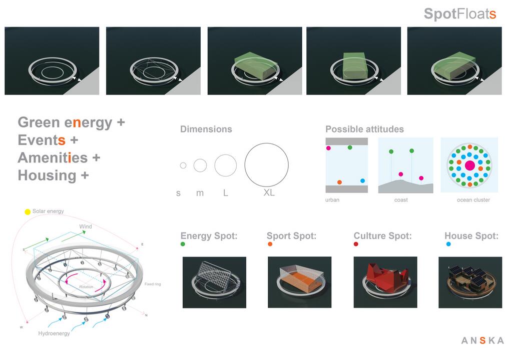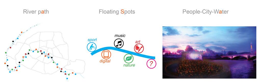在奧運(yùn)會(huì)中,“Spots”的模塊大多將被“鉤”到河岸編,一方方面可以在活動(dòng)進(jìn)行中提供一個(gè)游覽的路線,促進(jìn)游客對(duì)城市的探索。另一方面,“Spots”的每個(gè)“模塊”也可以發(fā)揮不同的用處,例如體育競(jìng)賽,示范表演,音樂(lè)會(huì)場(chǎng),信息中心,展覽平臺(tái)等。根據(jù)河流的寬度和地點(diǎn)的不同,一些模塊可以離開河岸,在塞納河上浮動(dòng)。