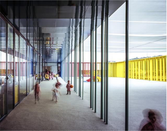 以2010年建成的多佩蒂特孔德幼兒園為例。它的外圍由兒童喜愛的明亮的彩虹管道構成,透過綠色樹脂玻璃的走廊則可以看到室外的群山。