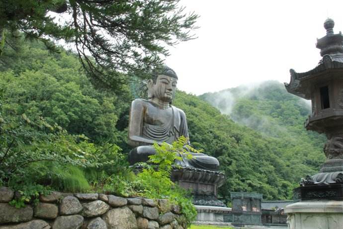 在去往神興寺的路上有巨大的青銅坐佛像,佛像位于寬闊的花崗巖高臺之上,高10多米。過了佛像右轉,在溪流上有一座新建的吊橋。過了橋,在石頭砌成的長墻一側有天王門,通往寺內。入口的兩旁有巨大的四天王雕像(持刀的持國天王、抱琵琶的多聞天王、托塔的廣目天王、握龍的增長天王)。神興寺的佛像是善正寺創建的時候立的,有彌勒佛、觀音菩薩、勢至像等義湘大師直接雕刻的佛像,還留有當時建造的法堂、大雄殿、冥府殿、保濟樓、七星閣等建筑,以及重點文化遺產第443號的香城遺址3層石塔。