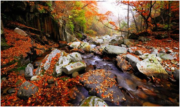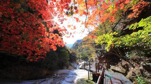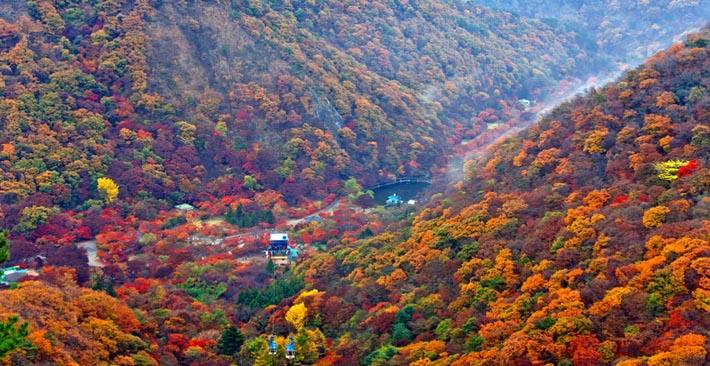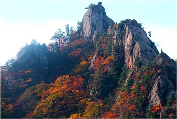 地處溫帶的韓國四季分明,到了秋天,無論城市或野外,處處可見色彩絢麗的楓葉。韓國七成是山,山坡上的楓紅、亮橙色夾著團團黃綠色,楓樹和楓的樹種匯集在一塊兒,韓國楓葉姹紫嫣紅,有它獨特的"楓"景。雪岳山地處韓國東北部的束草,束草是一個旅游資源十分豐富的城市,雪岳山可以說是韓國境內能最先看到楓葉的地方,雪岳山頂更是欣賞紅楓的一個最佳的地點。9月末雪岳山頂上的楓葉顏色漸漸變濃,到10月中就會掀起楓葉的"紅色"熱潮。