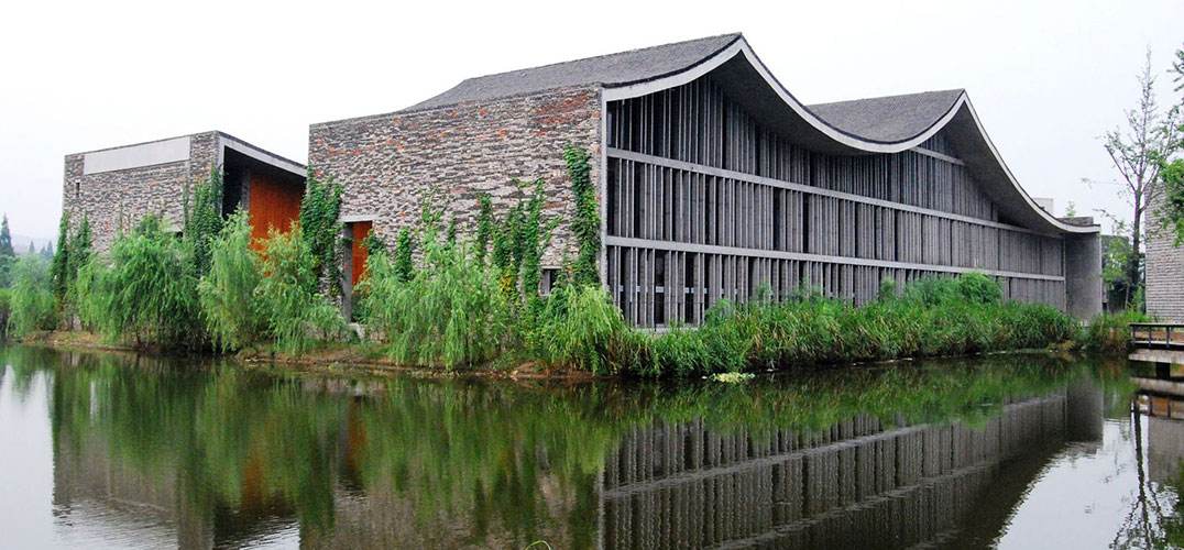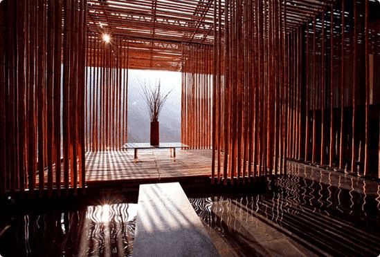 這座建筑是日本建筑設計師隈研吾的作品,叫“竹屋”。按照傳統做建筑,首先要做“三通一平”,“七通一平”,但這座建筑是建在一條山溝上,充分地利用地形建造,下面一層在山溝的底下,上面一層在山溝的上面。這座建筑的外表都用用竹子包起來,隈研吾認為,竹子是中國的符號和象征,在世界任何地方看到竹子,人們就會想到中國,在長城邊上建這樣一座建筑是很有意義的,長城又是農業文明和牧業文明的分水嶺,為了避免兩個文明的沖突所以建立起了長城;現在世界面臨的問題是東方文化和西方文化的沖突,東西方只有聯起手恢復信任,消除敵意,世界才能和平,才能向前發展。