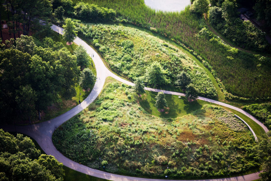 Michael Van Valkenburgh Associates事務所與韋爾斯利學院合作復興Alumnae Valley有毒的棕地,該區(qū)域之前是該學校的電廠、工業(yè)化天然氣泵站和一個175個位置的停車場。該事務所利用幾大策略改善了被污染的土壤:移除最具毒性的土壤,覆蓋和收集輕微污染的土壤,然后找方法將其作為該景觀的一部分。該區(qū)域原來是由冰河時代的冰川塑造而成的。這些道路沿線的山丘模擬原始的土地塑造形態(tài),同時儲存被修復的土壤。地勢、水文和校園生活的結(jié)合讓Alumnae Valley重新與周邊環(huán)境和諧發(fā)展起來。