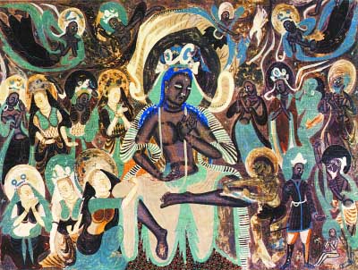 20世紀(jì)40年代初,一些美術(shù)家開(kāi)始造訪莫高窟,其中最早的是河南人李丁隴,但引起人們注意的還是張大千的敦煌之行。1941年,張大千帶人前往敦煌,在莫高窟住了一年多,他先是用自制的透明紙蒙在壁畫(huà)上過(guò)稿,再拷貝到宣紙上描線涂色,一年多下來(lái),臨摹了200余幅。在蘭州、成都、重慶連續(xù)舉辦臨本展時(shí),參觀者眾多,并引起了文化界和政界的注意。雖然張大千的臨本有些地方根據(jù)自己的愛(ài)好進(jìn)行了改動(dòng),有些色彩不夠準(zhǔn)確,渲染層次也不夠,但總體上反映了敦煌壁畫(huà)的框架結(jié)構(gòu),線描也很流暢,效果還是不錯(cuò)的。