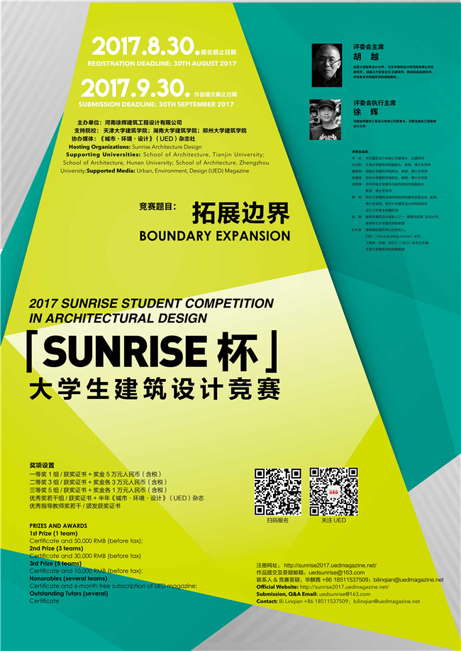2017年的第四屆競賽由天津大學建筑學院、湖南大學建筑學院、鄭州大學建筑學院支持,《城市·環境·設計》(UED)雜志社作為協辦媒體。競賽邀請全國工程勘察設計大師、北京市建筑設計研究院總建筑師胡越擔任評委會主席,河南徐輝建筑工程設計有限公司董事長、河南省首批工程勘察設計大師徐輝擔任執行主席,齊欣建筑設計有限公司董事長齊欣、天津大學建筑學院副院長孔宇航、湖南大學建筑學院院長魏春雨等國內知名建筑師、高校學者組成評審團。本次競賽以“拓展邊界”為題,通過建筑內部空間的關系以及建筑與環境聯結的不同方式,實現對功能環境諸矛盾的選擇和平衡,拓展建筑的新疆界。