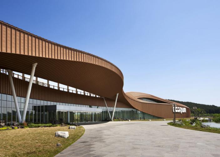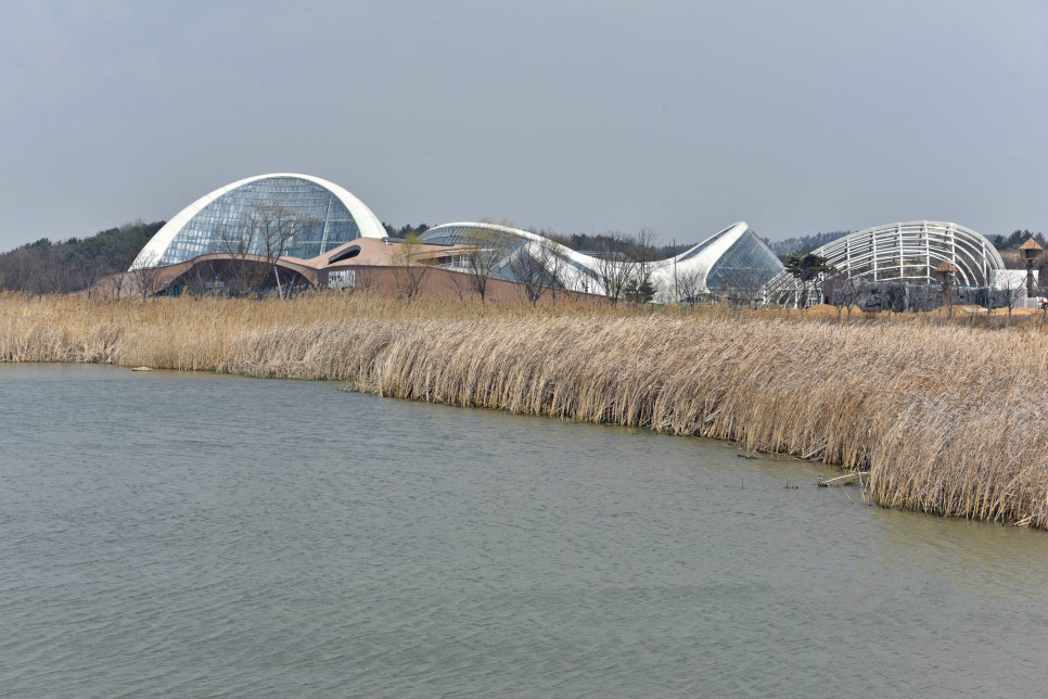 格利姆肖建筑師事務所2013年11月完成了位于韓國舒川的生態公園設計,占地面積達到99.8萬平方米,整個規劃中熱帶植物、瀑布和企鵝園被安置在巨大的由鋼和玻璃構成的人工生態圈中。整個設施被用來展示世界的不同類型的氣候,熱帶、溫帶、地中海、極地等多樣的氣候。建筑內有五個復雜的生物群落,它們分屬于不同的氣候區。基于群落內河流與池塘的形狀,建筑的平面采用了彎曲的半圓形狀。其實正如建筑師所說,該項目概念的靈感,來源于蜿蜒的河流水體不斷侵蝕地表所產生的形式。彎曲的鋼梁創造出拱形的屋頂輪廓,而輕質的玻璃幕墻幫助每個空間可以最大化地獲得自然光。