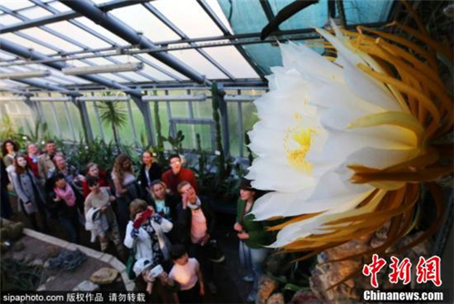 當地時間2017年5月23日,俄羅斯圣彼得堡,一種名為大花蛇鞭柱的花朵在當地植物園里盛開。該物種極其稀有,一年只開花一次,每次開花時間只有幾個小時。