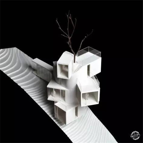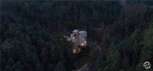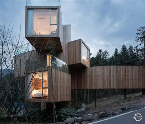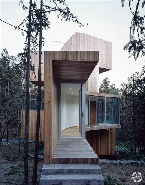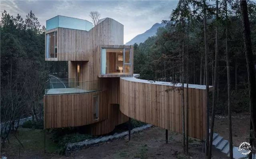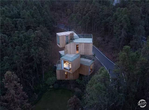 2013 年,一個名為“自由家”的開發(fā)項目來到這里,想要把休寧縣內(nèi),隸屬齊云山景區(qū)的山林,打造成一個野外營地。自由家分為樹屋世界和營地博覽園兩塊。其中,樹屋世界就是請建筑師設(shè)計的、位于松林中的一些獨棟的房屋。而營地博覽園內(nèi)的住宿,與樹屋世界相比,更同質(zhì)化一些,價格也要便宜很多。這個樹屋世界目前已經(jīng)進行了三期規(guī)劃。最近的一期,是請了好幾位不同的建筑師,每個人設(shè)計了一個樹屋。它們林立在山林之中,游客可以在山腳處的服務(wù)中心登記入住,再乘坐營地內(nèi)的電瓶車,到達這幾棟彼此獨立的屋子。我們之前曾寫過自由家項目中的一個樹袋屋,風(fēng)格原始而質(zhì)樸。除了它之外,還有一棟由體塊相互疊加而成的獨特建筑,也隱藏在這片紅雪松林當(dāng)中。