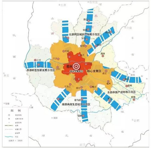 其中,一核即鄭州大都市區(qū),以鄭州國(guó)家中心城市為中心,包括鄭州市域,開封、新鄉(xiāng)、焦作、許昌中心城區(qū)等四個(gè)次級(jí)中心,以及鞏義市、武陟縣、原陽縣、新鄉(xiāng)縣、尉氏縣、長(zhǎng)葛市、平原城鄉(xiāng)一體化示范區(qū)等新興增長(zhǎng)中心;一副即洛陽中原城市群副中心城市;四軸即沿隴海發(fā)展主軸、沿京廣發(fā)展主軸、濟(jì)南 鄭州 重慶發(fā)展軸、太原 鄭州 合肥發(fā)展軸;四區(qū)即北部協(xié)同發(fā)展示范區(qū)、東部承接產(chǎn)業(yè)轉(zhuǎn)移示范區(qū)、西部轉(zhuǎn)型創(chuàng)新發(fā)展示范區(qū)、南部高效生態(tài)經(jīng)濟(jì)示范區(qū)。