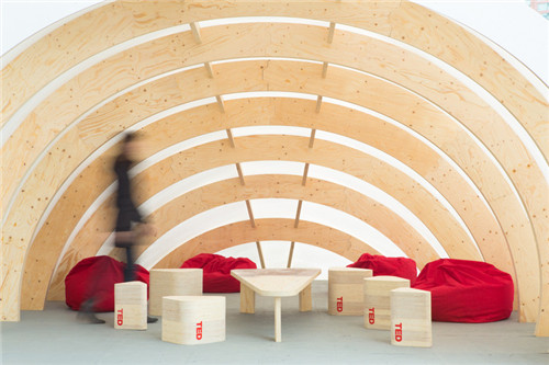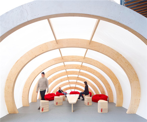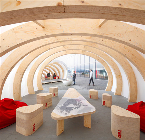 這組溫暖的小屋由METSAWood捐贈的高級木制品LaminatedVeneerLumber(LVL)建成,并以CNC雕刻而成。該結構被逐漸縮小的表皮包圍,讓TEDsters與外界元素隔開,并創造一個溫暖的具有暴露天然木材的室內空間。每個小屋都擁有一張大桌子和若干小凳子,將溫暖的小屋變成一個大的休息區,游客可以聚集在一起或休息。