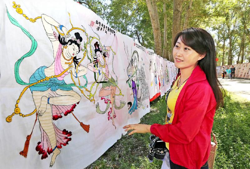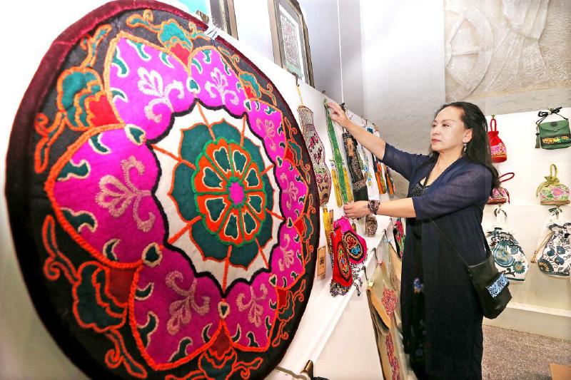 繡針飛舞,彩線織錦。6月10日,在新疆慶祝首個全國“文化和自然遺產日”暨第五屆新疆非物質文化遺產展示周活動的主會場吉木薩爾縣北庭故城高昌回鶻佛寺遺址博物館一樓大廳,來自全疆各地各單位、院校、企業的民族刺繡作品匯聚在一起,琳瑯滿目,色彩斑斕,已然是一場民族刺繡的盛宴。這些民族刺繡作品用不同理念、不同定位和不同方式,傳承著文化遺產,收獲著不同的社會和經濟效益,成為這個遺產日最醒目的一道文化風景。