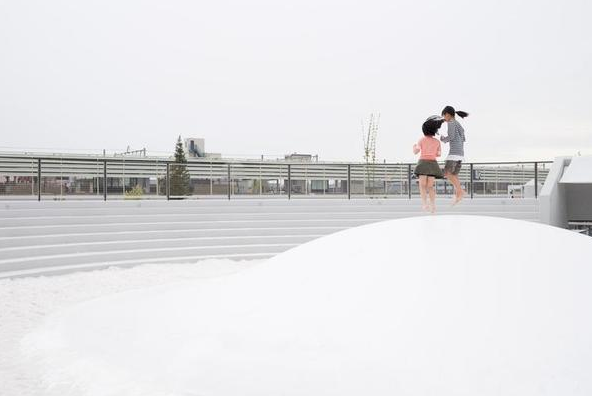 不止是提供了可以充分休憩的場所,CoFuFun 同樣也是個吸引人的游樂場。在這些不同的圓形空間里,藏著巨大的白色彈性蹦床、露天劇場、也有可以被當作是滑梯的斜坡。