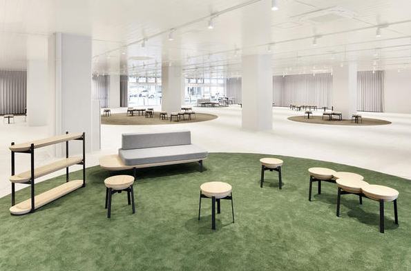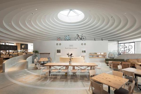 這些白色的“圓盤”名為 CoFuFun,它出自日本當紅設計工作室 Nendo 之手,與圓形的草坪一起,構成了一個共占地 6000 平方米,融合了自行車租賃、咖啡廳、商店、信息亭、游樂區、戶外舞臺和會議室的新型多功能廣場。現在,CoFuFun 不僅是市民們出行的必經之地,也是打發閑暇時光的好去處。