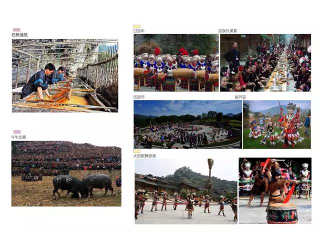在整體規劃布局確定之后,設計團隊又根據民俗考察報告的內容,將斗牛、斗雞、斗鳥等丹寨傳統的斗藝活動及石橋古法造紙、苗族錦雞舞、苗族蠟染、芒筒蘆笙祭祀樂等7項國家級非物質文化遺產項目、16項省級非物質文化遺產項目植入其中,起到對傳統文化進行保護和傳承的作用。