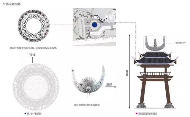 錦雞舞,來自苗族的一個分支錦雞苗族,因崇拜錦雞并在重要節日、祭祀活動中跳舞而得名,錦雞廣場在設計時充分展現了錦雞舞的柔美特色、并在其中融合了苗族銀飾、苗族服飾等元素。