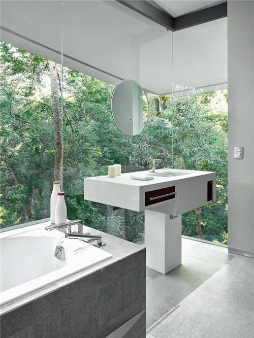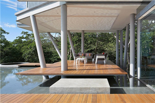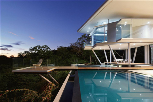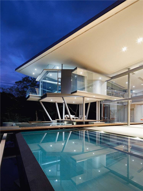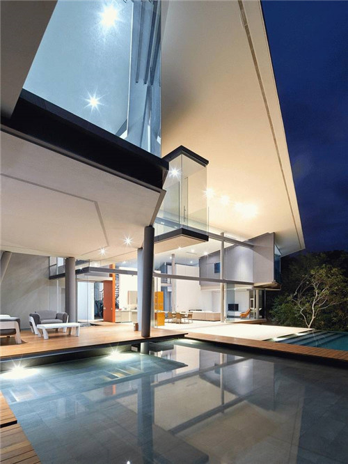 房子的前面是一個(gè)懸空的泳池,而泳池上面又是一個(gè)懸空式的觀景臺(tái),觀景臺(tái)仿佛一個(gè)脫離了主體建筑的獨(dú)立結(jié)構(gòu),這樣,使得建筑擁有了更美妙的觀景視野,獨(dú)特的設(shè)計(jì)讓整個(gè)別墅有了無以倫比的詩意享受。