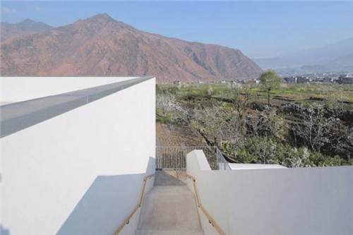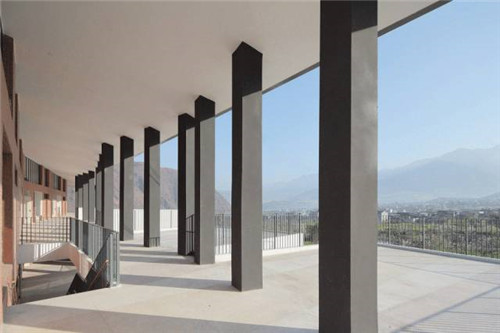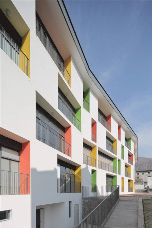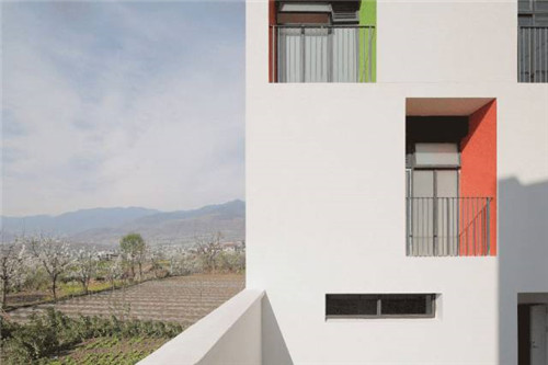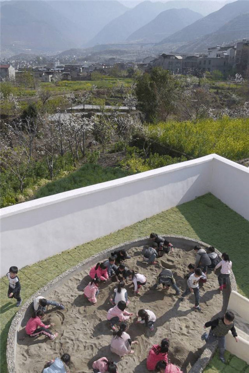 根據(jù)相關(guān)安全規(guī)定,場(chǎng)地邊界由設(shè)計(jì)初期的通透圍欄改為后來(lái)的密閉實(shí)體圍墻,卻意外使內(nèi)與外形成了另一幅有趣的場(chǎng)景。密閉的圍墻強(qiáng)化了幼兒園的領(lǐng)域感,內(nèi)側(cè)是兒童的嬉戲,外側(cè)是田園的耕作。內(nèi)外的交流在首層被暫時(shí)隔斷,首層室外場(chǎng)地成為純粹的內(nèi)聚的空間。而二、三層的平臺(tái)與走廊,使視線與外部再次連通。這種直接空間的交流反而形成一種儀式感。村民每日沿圍墻走向田間,開始勞作,而圍墻內(nèi)、小朋友們也正開始著這一天的晨間活動(dòng)。幼兒園與村莊共享自然環(huán)境,有共同的生活作息,已然融入了鄉(xiāng)村生活中。
