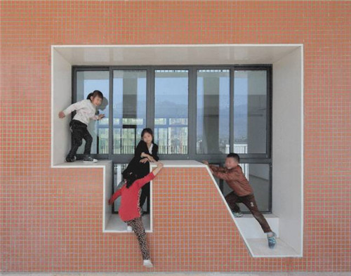 走廊空間發(fā)掘出更多活動(dòng)的可能性。走廊被不規(guī)則地拓寬形成“街道”,如首層的入口、二層的閱讀平臺(tái)、三層的屋頂露臺(tái),組織方式如同周邊村落內(nèi)的道路聯(lián)系著大小各異的房屋曬臺(tái)、田地,也聯(lián)系著每家每戶。幼兒園每個(gè)功能用房對(duì)應(yīng)著“街道”,也有著表情各異的門及窗戶。深窗臺(tái)形成高低錯(cuò)落的壁龕。發(fā)生在這個(gè)微縮街道里的交往,伴隨著幼兒的日常,潛移默化地融入他們的成長(zhǎng)經(jīng)歷。