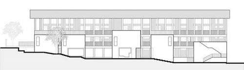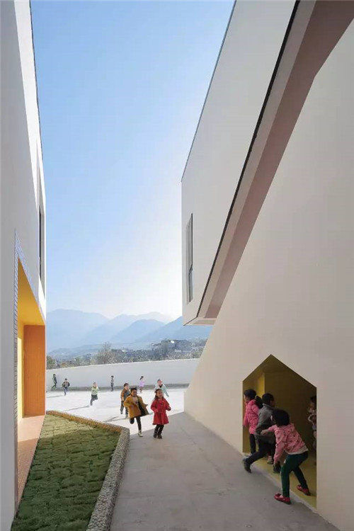 相對(duì)于 12 班幼兒園用地 4300平方米 的建設(shè)標(biāo)準(zhǔn),項(xiàng)目用地只有 2490平方米,非常緊張。設(shè)計(jì)首先回應(yīng)場(chǎng)地面積不足的問(wèn)題。集約式布局為地面更多的幼兒活動(dòng)空間提供了可能。12 個(gè)活動(dòng)室單元分三層疊放于場(chǎng)地靠學(xué)校的一側(cè),用加寬的走廊聯(lián)系起來(lái)。休息室、音體活動(dòng)室以一至二層的小盒子的形式,分散插入主體體量,小盒子的頂部成為多個(gè)室外場(chǎng)地。首層局部架空成為入口。風(fēng)沿著河谷吹來(lái),經(jīng)由建筑體量形成的縫隙輕拂而過(guò)。