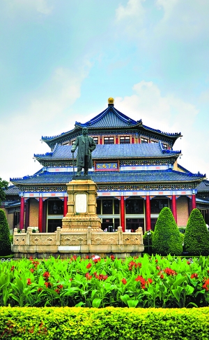 廣州市中山紀念堂是廣州人民和海外華僑為紀念孫中山先生集資興建的。1929年1月動工,1931年11月建成。1956年,重鑄的5米高的孫中山先生銅像屹立在紀念堂前。1963年對紀念堂進行了大規模翻修,屋頂全部采用藍色琉璃瓦。這座八角形建筑,外形莊嚴宏偉,設計師巧妙運用了建筑力學的結構原理,采用鋼架和鋼筋混凝土混合結構,跨度達71米的建筑空間內不設一柱。