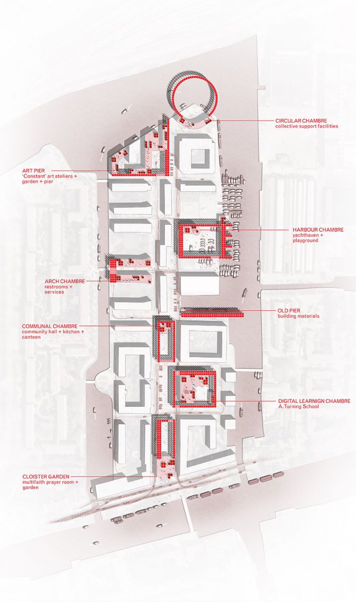 針對這個問題,荷蘭FABRICations建筑事務所、LADA建筑事務所和來自Failed Architecture的rené boer通力合作,通過實驗性政策和探索新設計,打造出一個可以為移民之間提供互動交流的,并可以推動他們與當地居民互動的特色區域。但如何界定"開放城市"? 什么資源可以使這些移民成為一個充滿活力的城市階級?又將如何設計使城市吸收接受這些移民同時又不把他們作為阿姆斯特丹城市開發的工具?作為2017年國際社會住房盛會的一部分,這項研究以阿姆斯特丹的wittenburg地區為例進行探討,將新興社會住宅、工作類型與現有的公共建筑、參與者與代理之間進行融合。