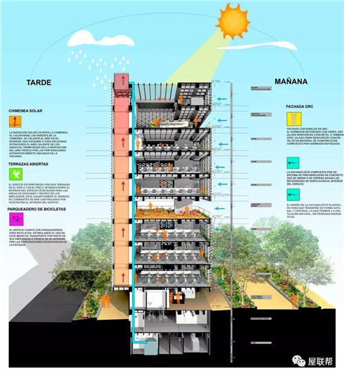 這個(gè)設(shè)計(jì),通過(guò)預(yù)制的外墻系統(tǒng)、太陽(yáng)能電池板、太陽(yáng)能煙囪、溫度校準(zhǔn)、熱浮力,以及不使用空調(diào),代表了對(duì)麥德林可持續(xù)建筑創(chuàng)新的嚴(yán)肅承諾。