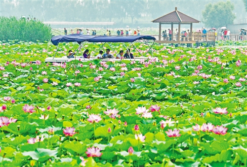 雄安新區將建成“藍綠交織、清新明亮、水城共融”的生態城市。圖為游客在白洋淀景區內觀賞荷花。 (資料圖片)
