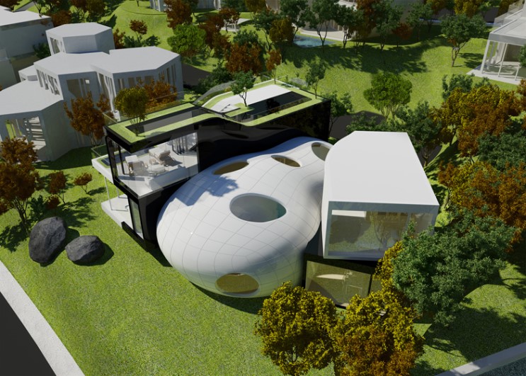 這座蠶繭別墅,以韓國濟州島的火山地形和蠶繭生命體作為有機體,由首爾建筑師事務所PlanningKorea設計而成。房子的中心位置是蠶繭,由外向內保護整個生命體,營造一個天然的生活空間。整座建筑于2012年9月開始,2015年竣工。